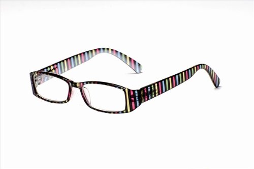 Women's fashion reading glasses. High gloss frames with multi coloured stripe detail.