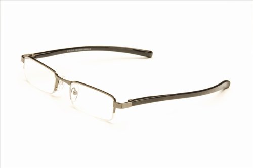 Men's gunmetal half rim fashion reading glasses with black plastic temple arms.
